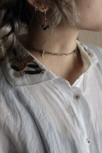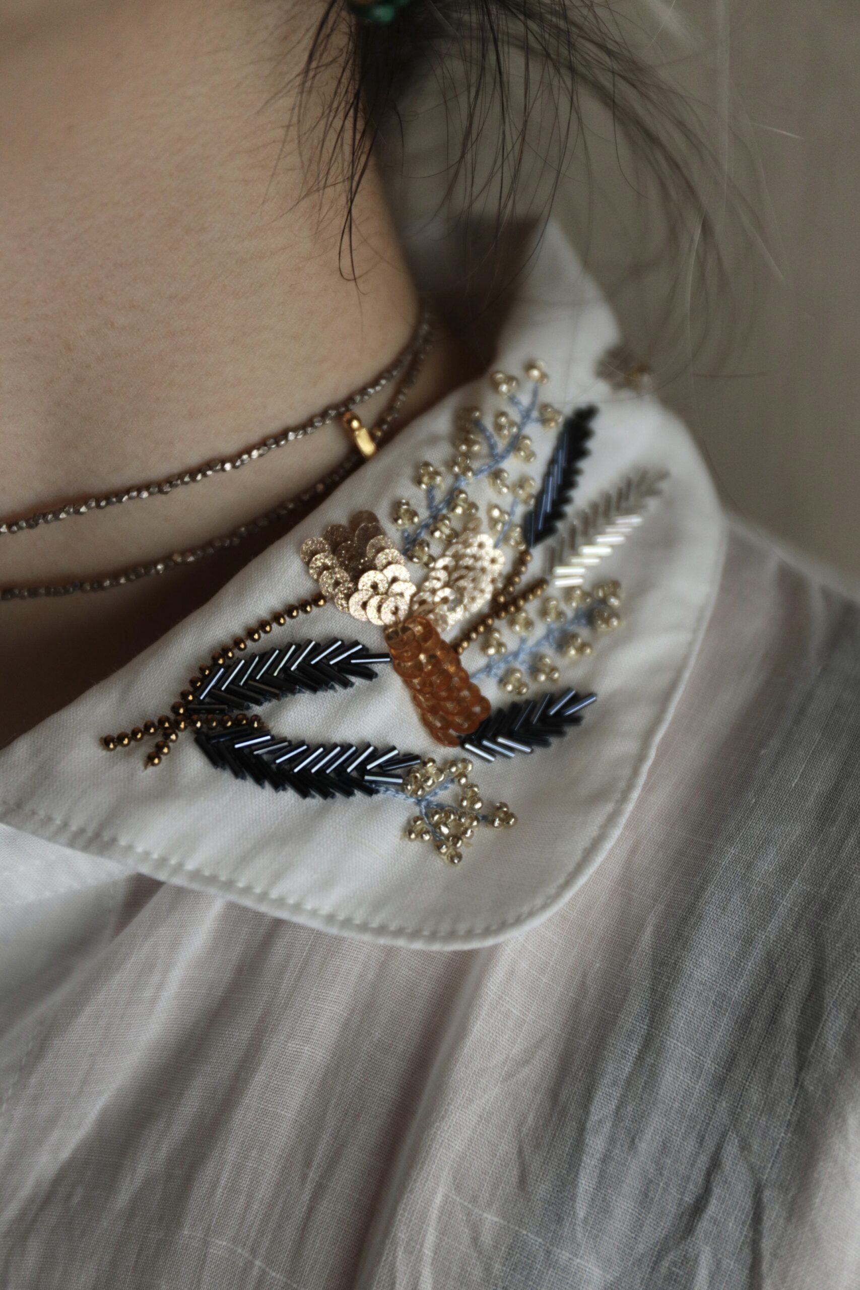 襟元に密かに佇む金糸のハンドステッチも、