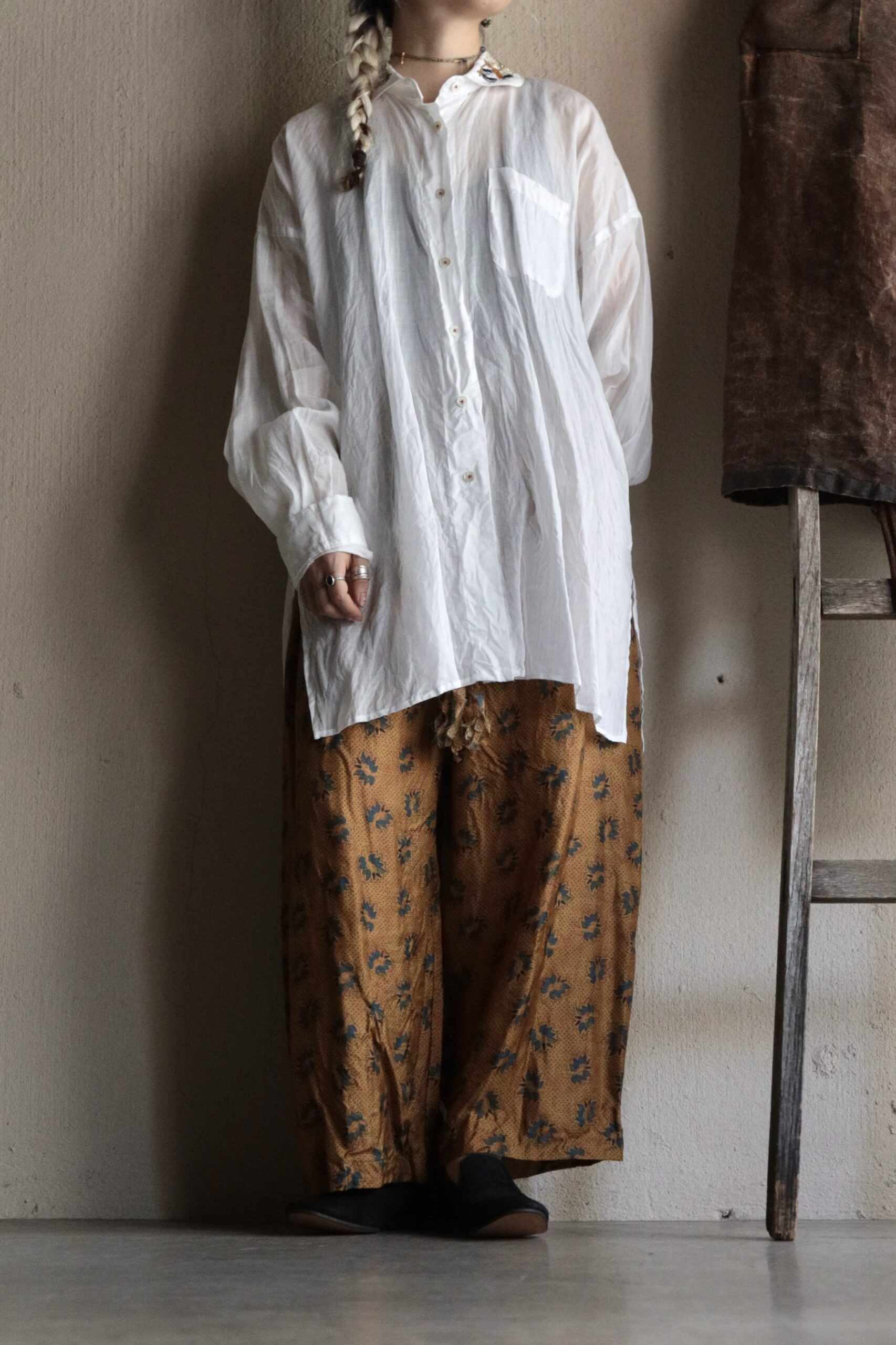| スタイリング | Bottoms:TOWAVASE / Silk Wide Pants Shoes:SHOE&SEWN / Joe Kid-suède |
