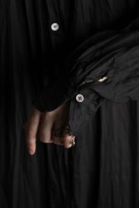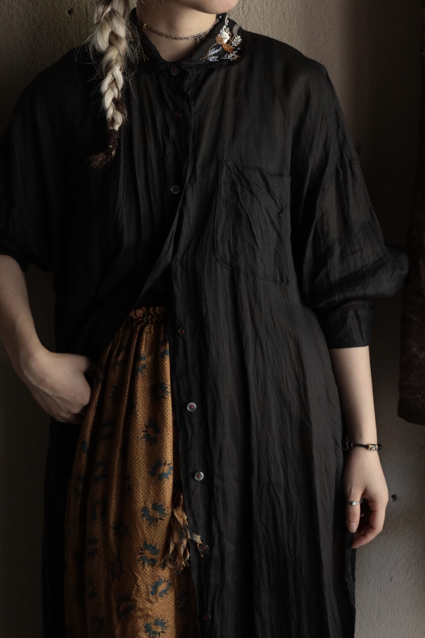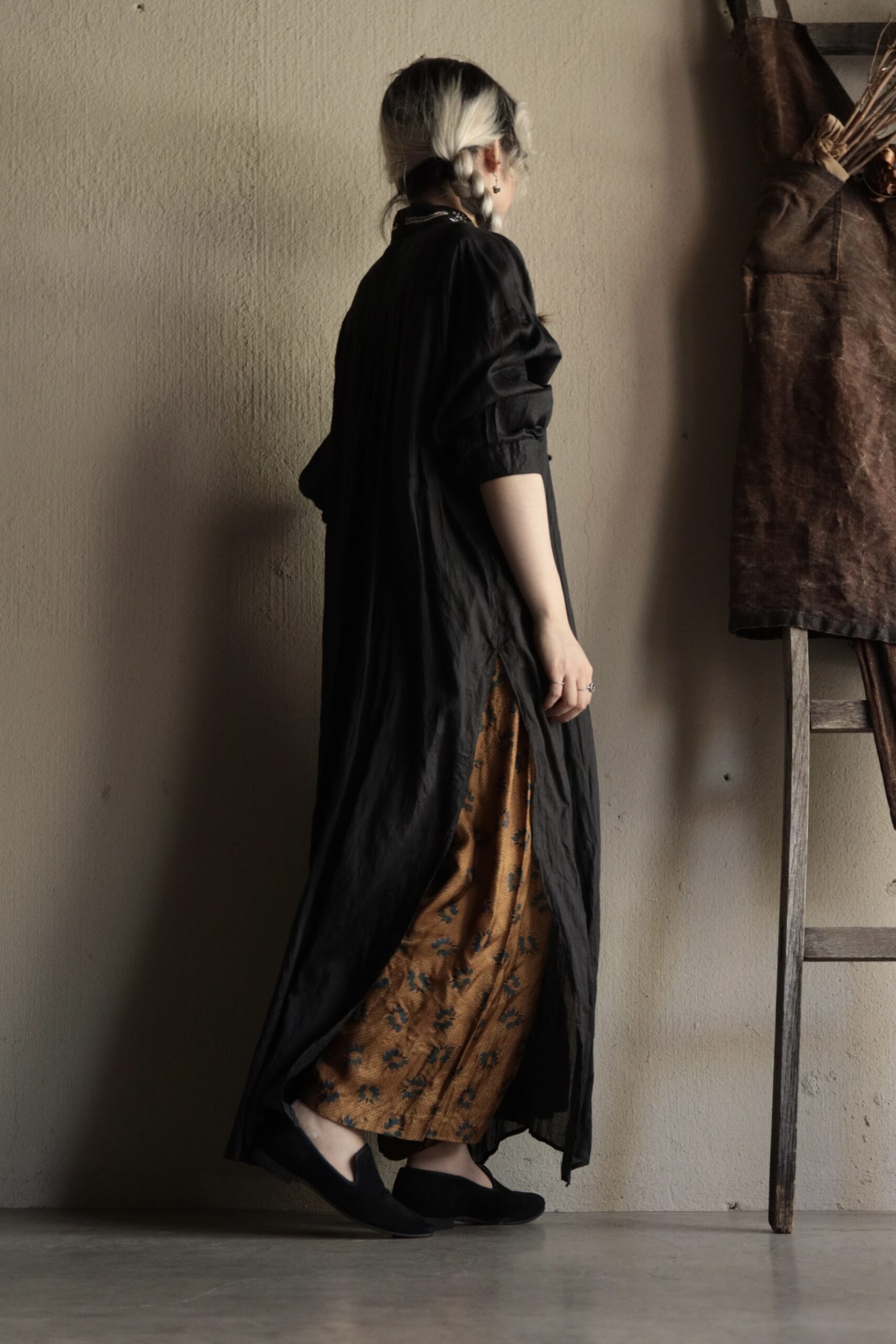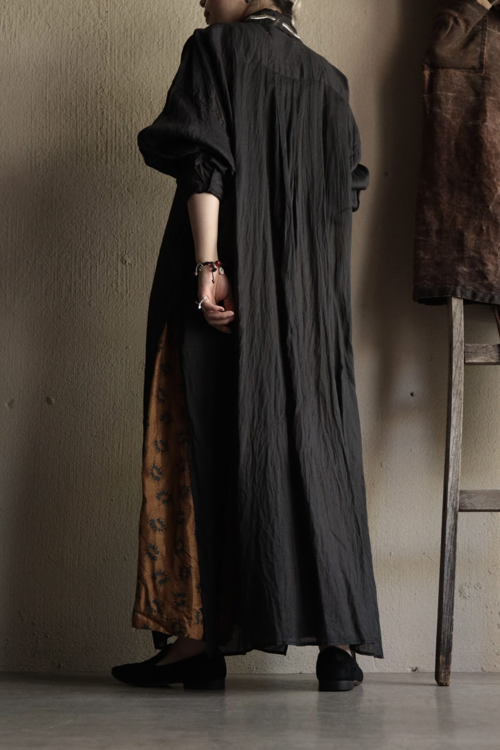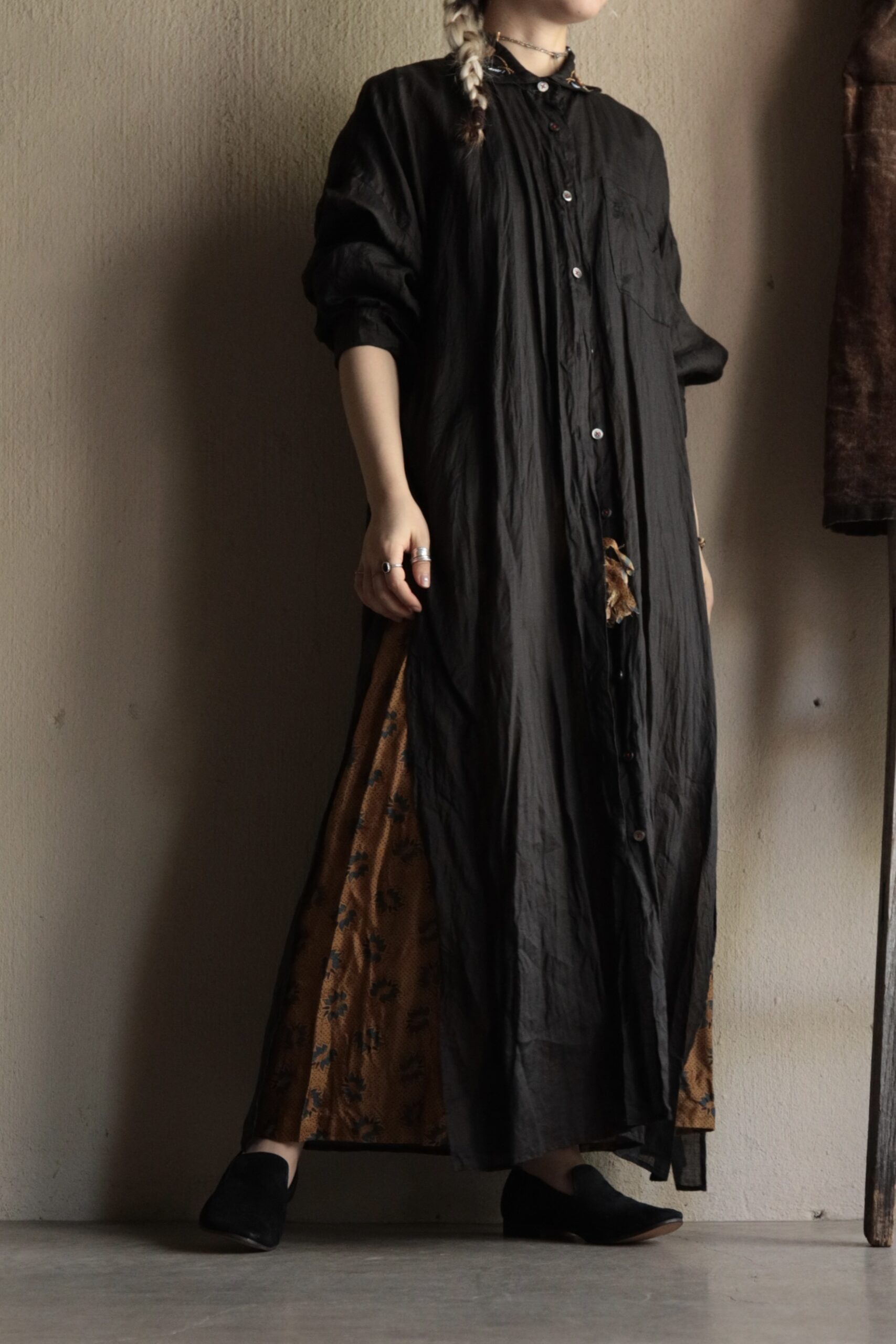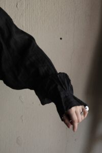 リネンのブラックロングシャツ。