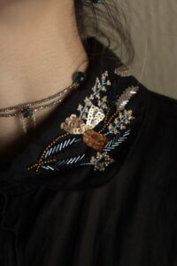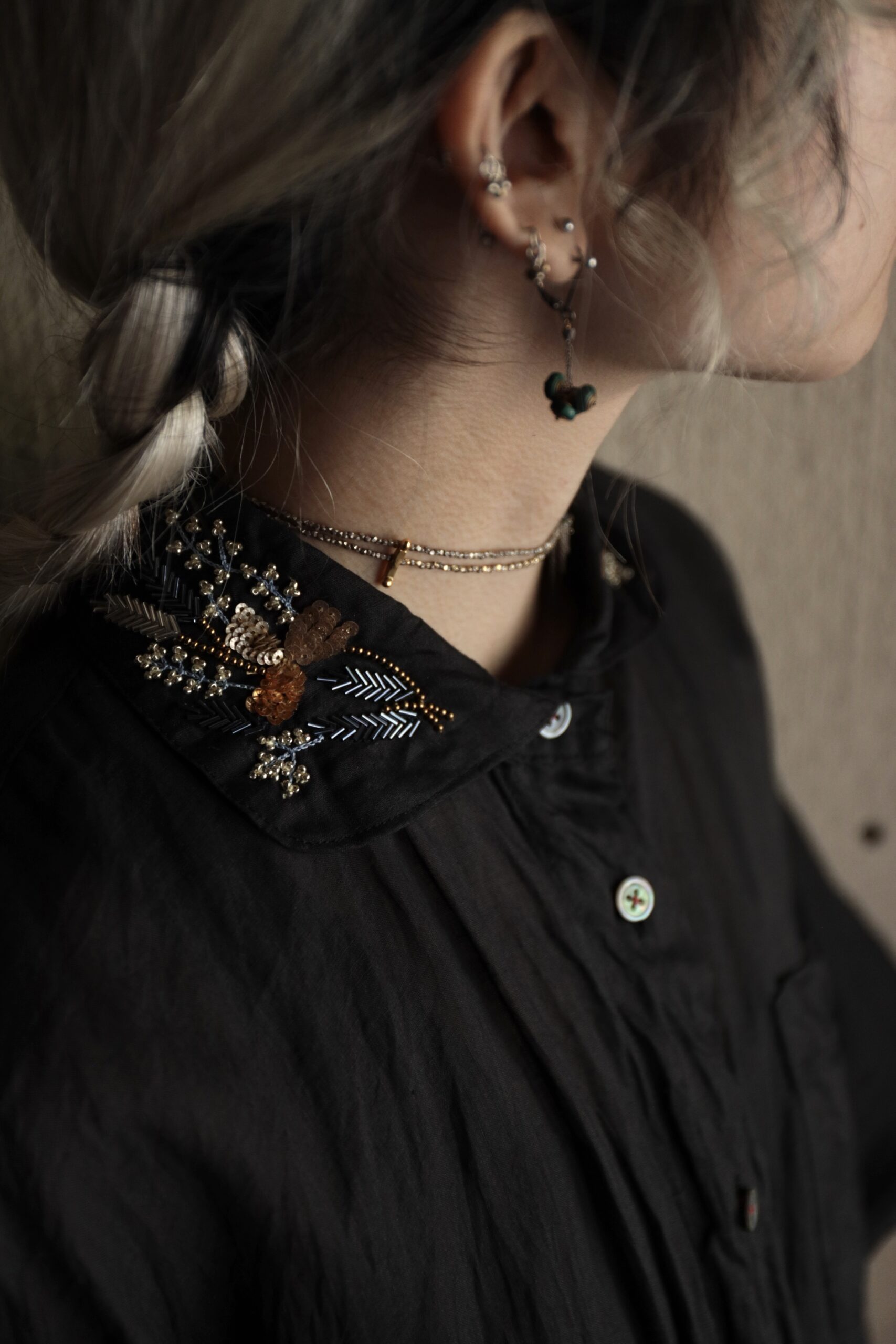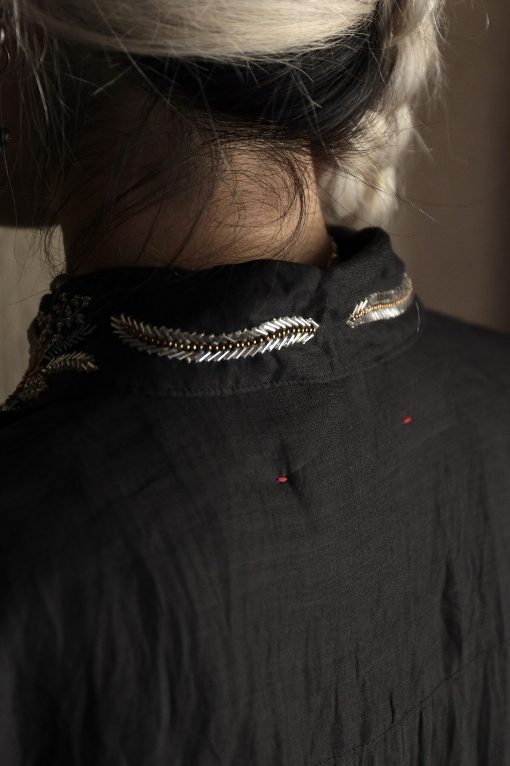 襟元に密かに佇む金糸のハンドステッチも、