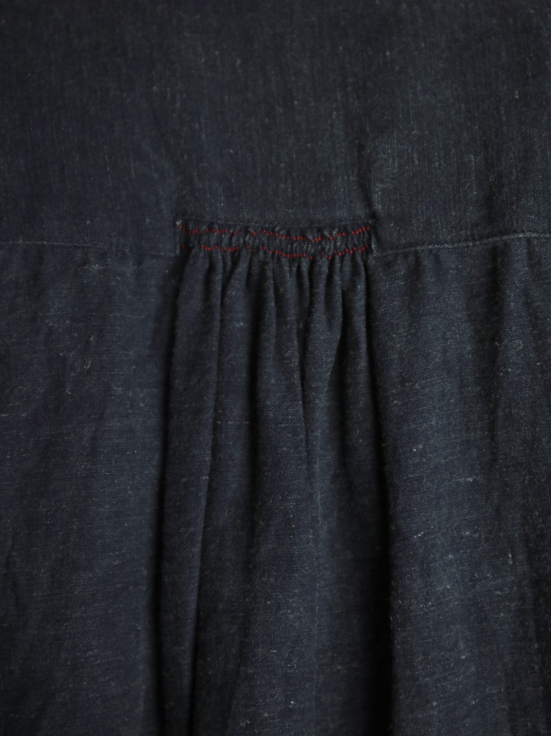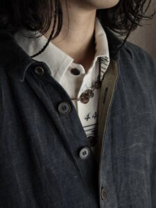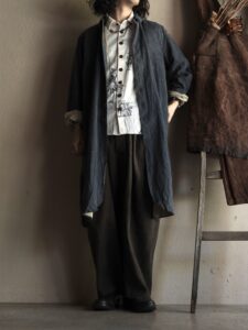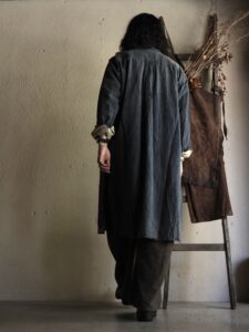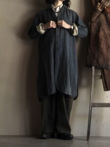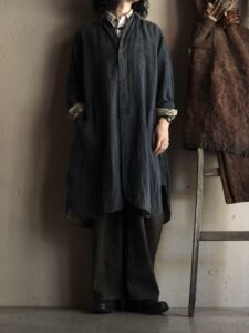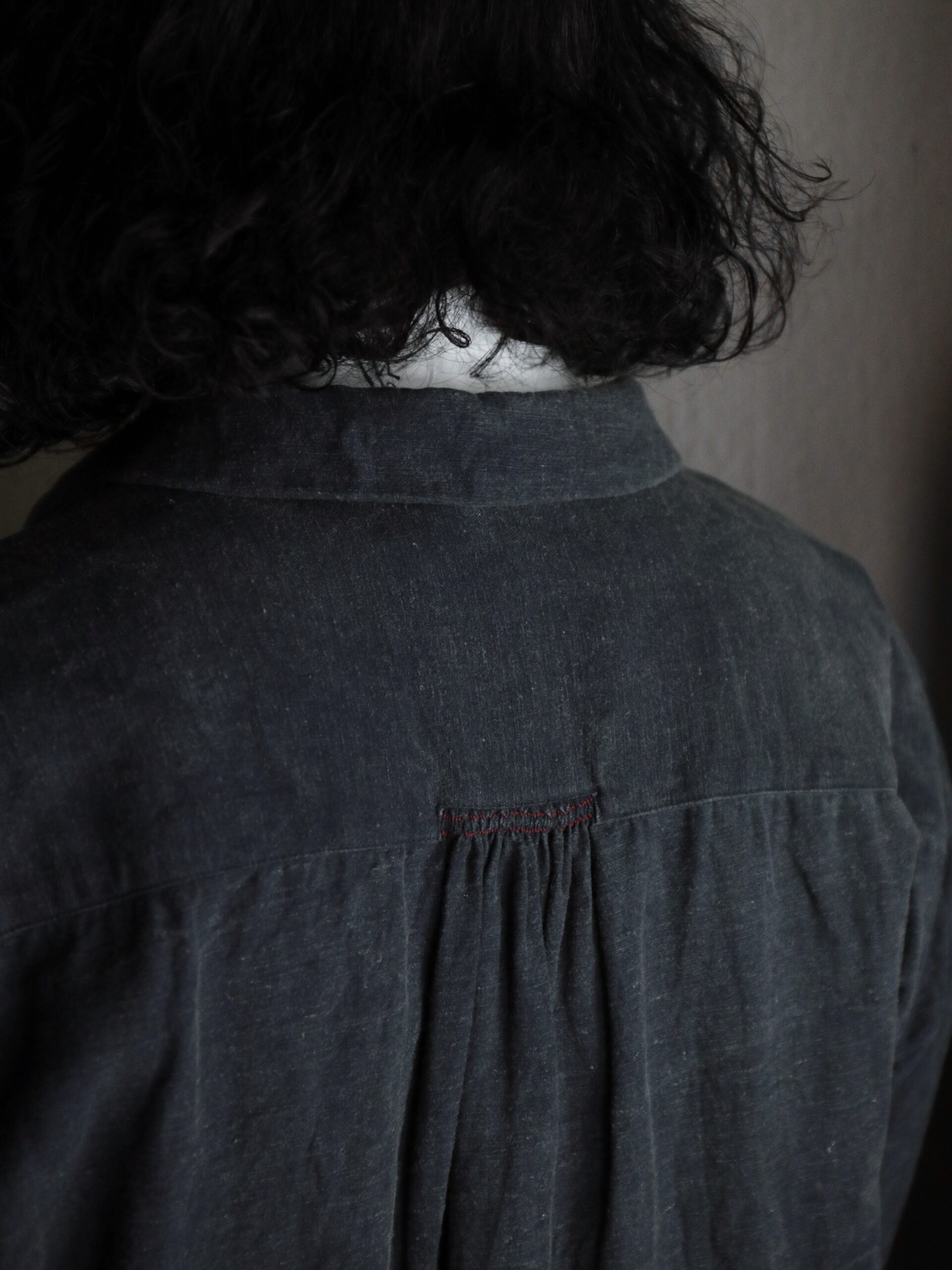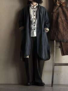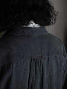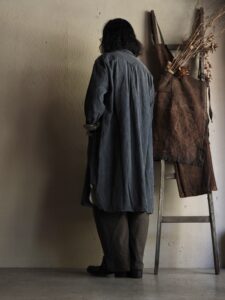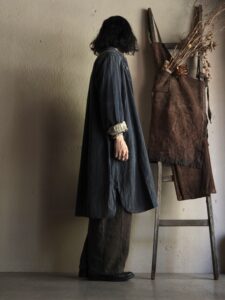 前開きのディティールが特徴で、途中から身返しをなくし、プルオーバーのスモックのようにもみえるような設計。