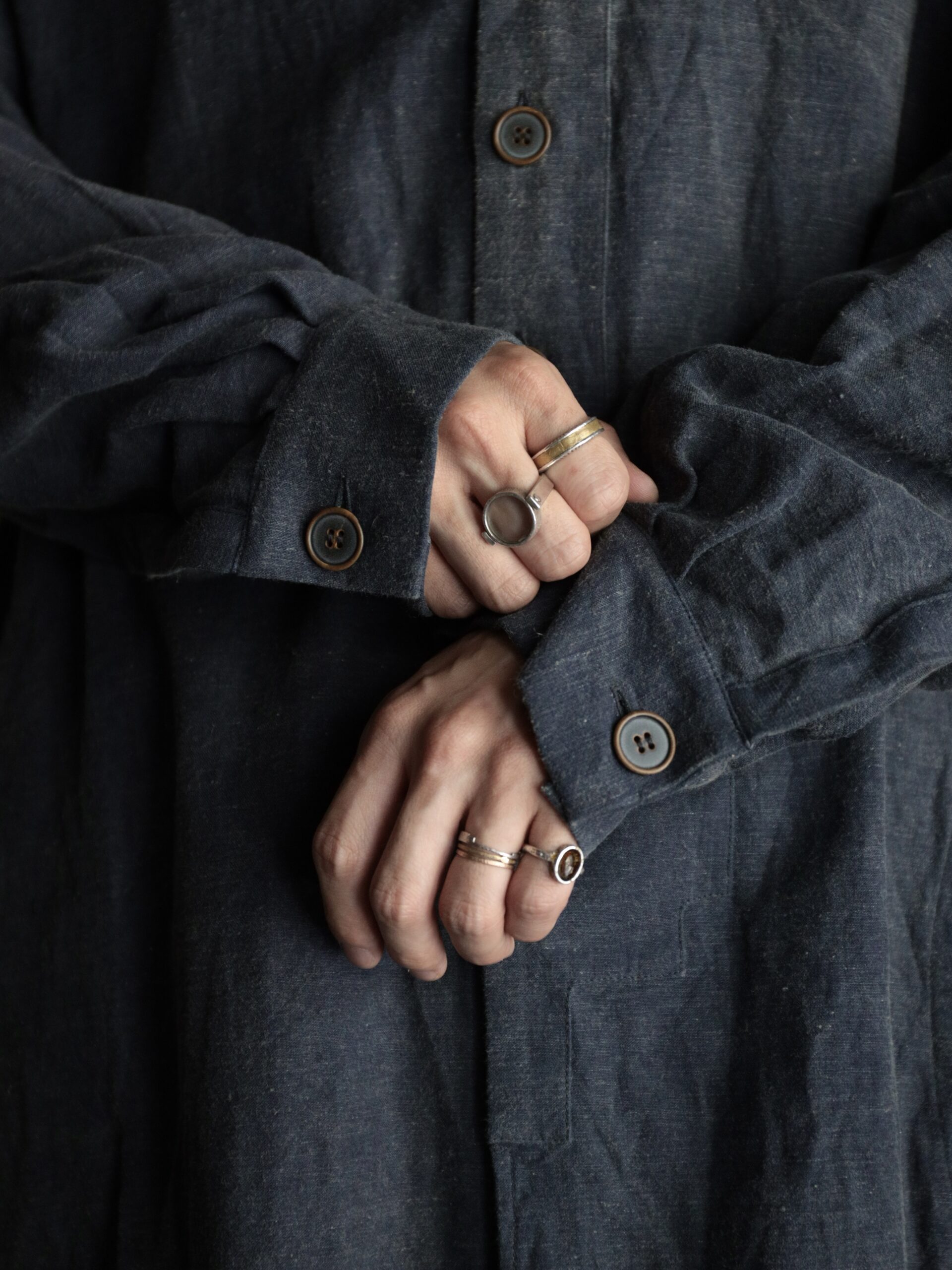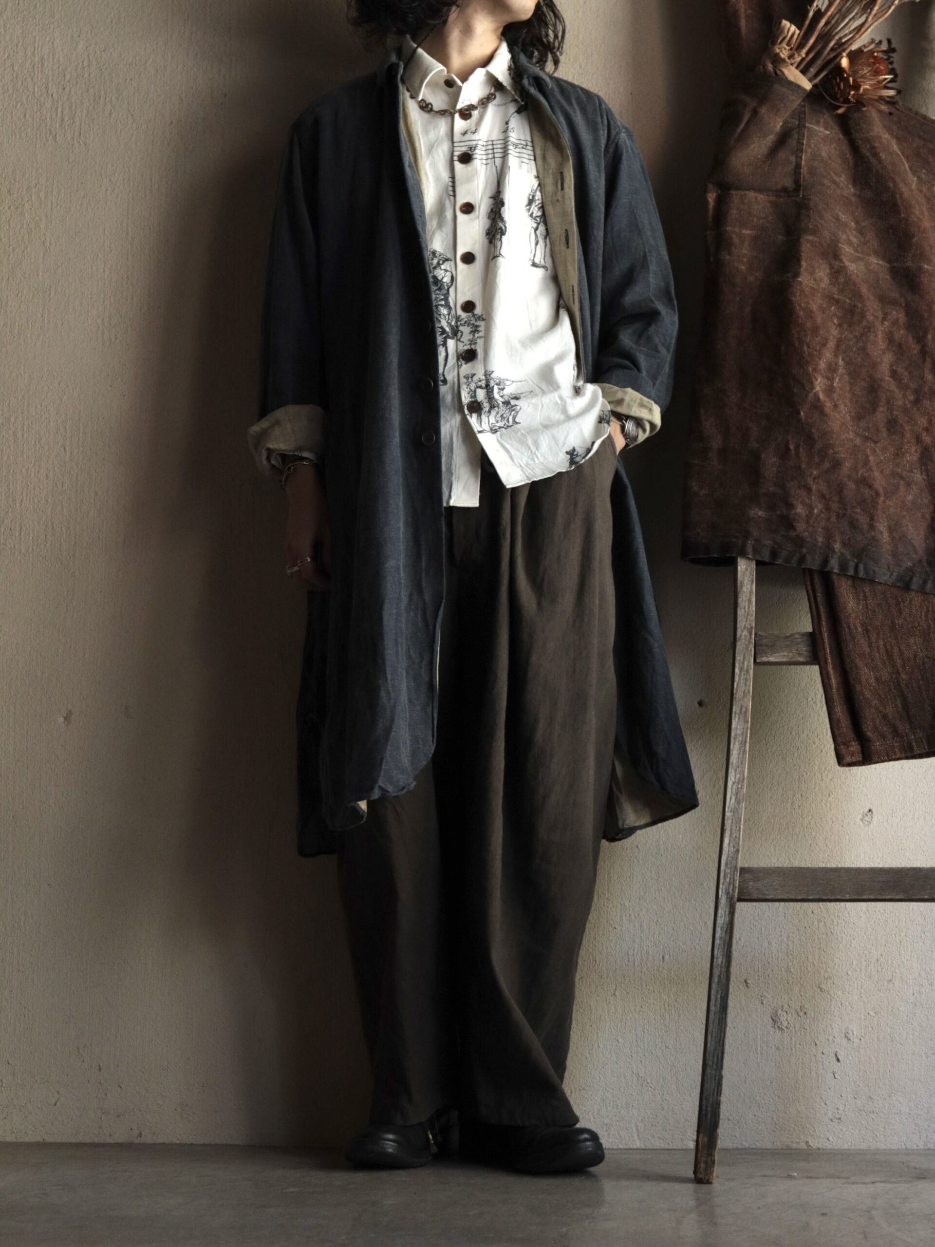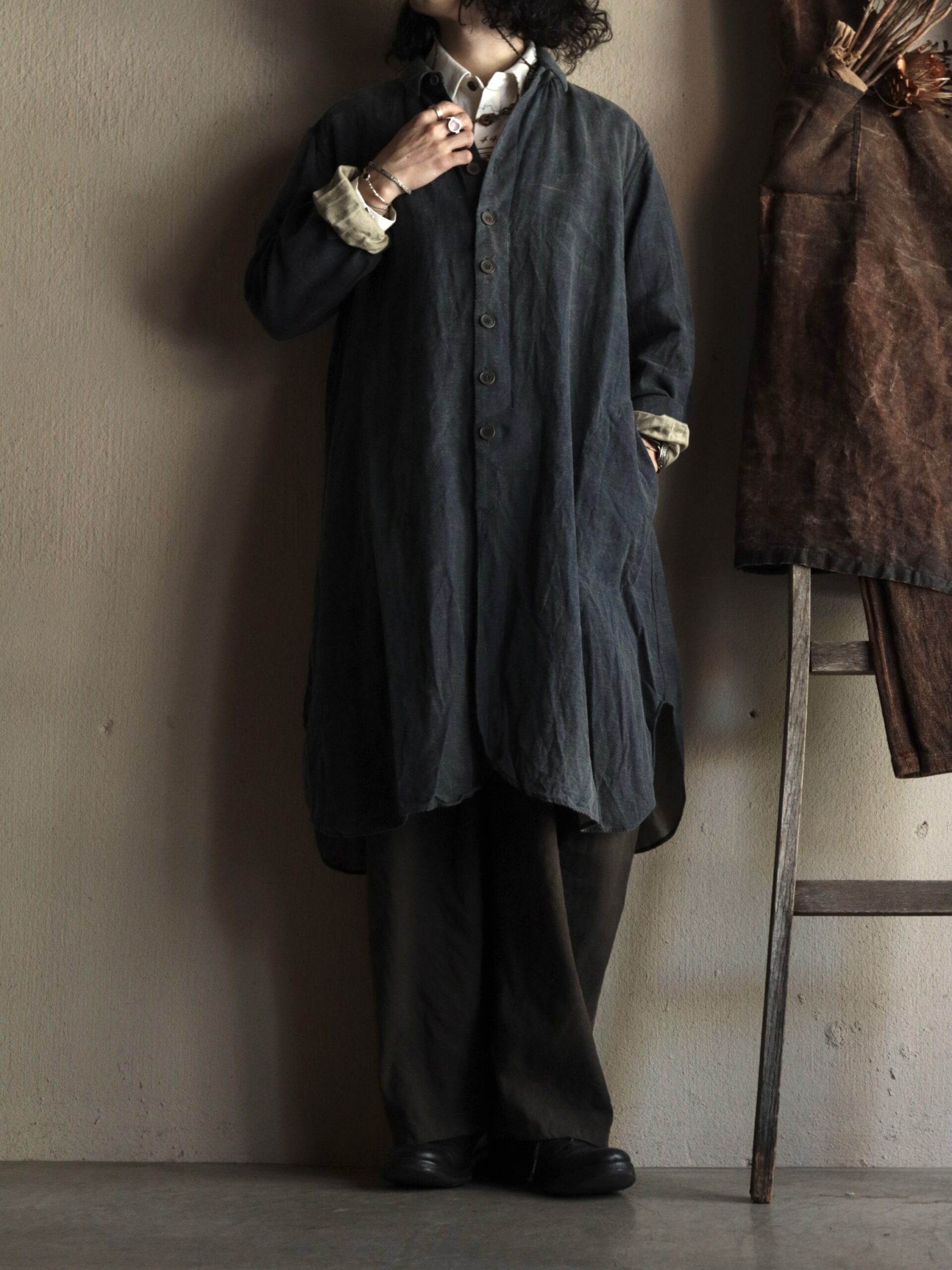前開きのディティールが特徴で、途中から身返しをなくし、プルオーバーのスモックのようにもみえるような設計。
