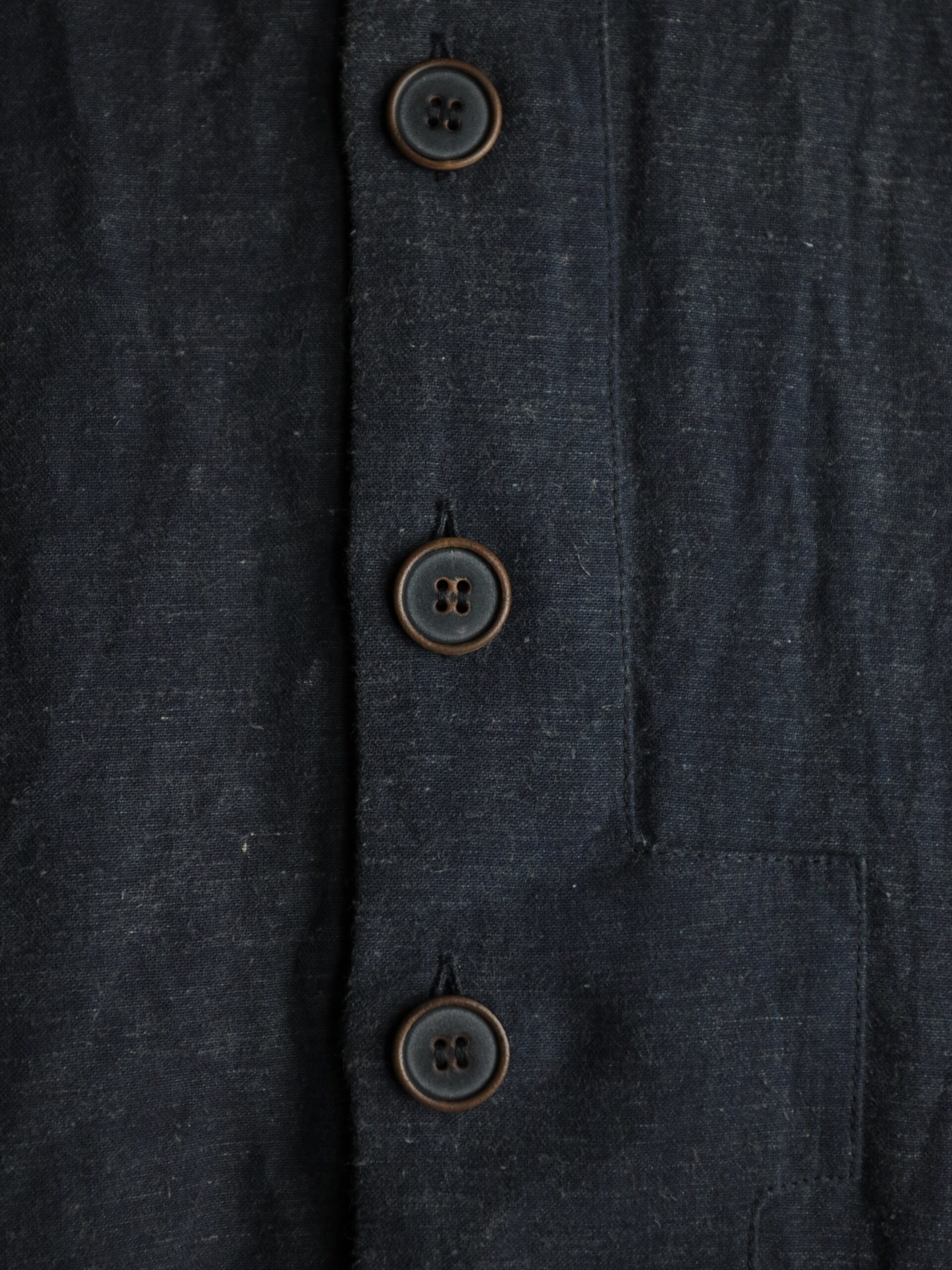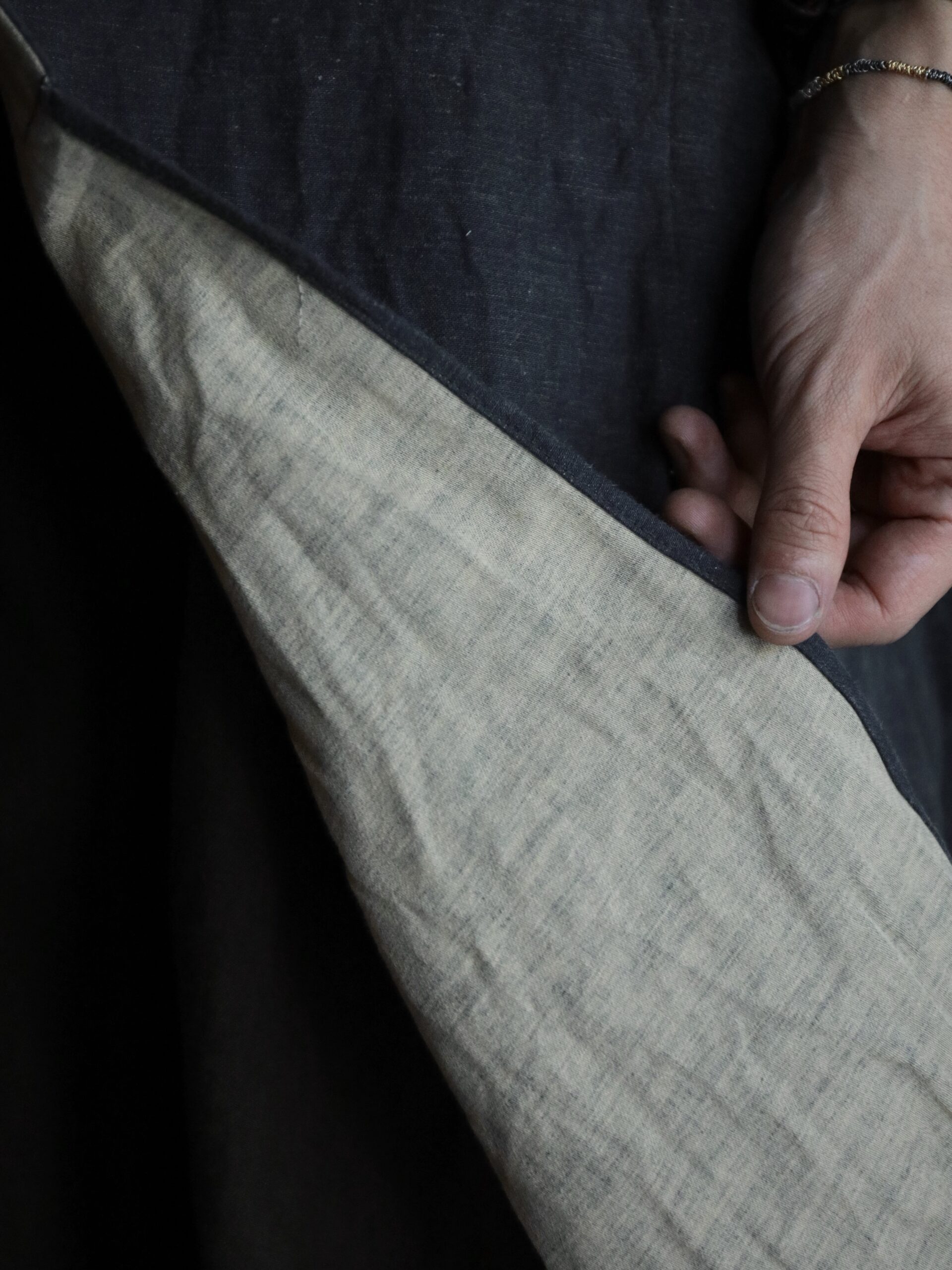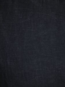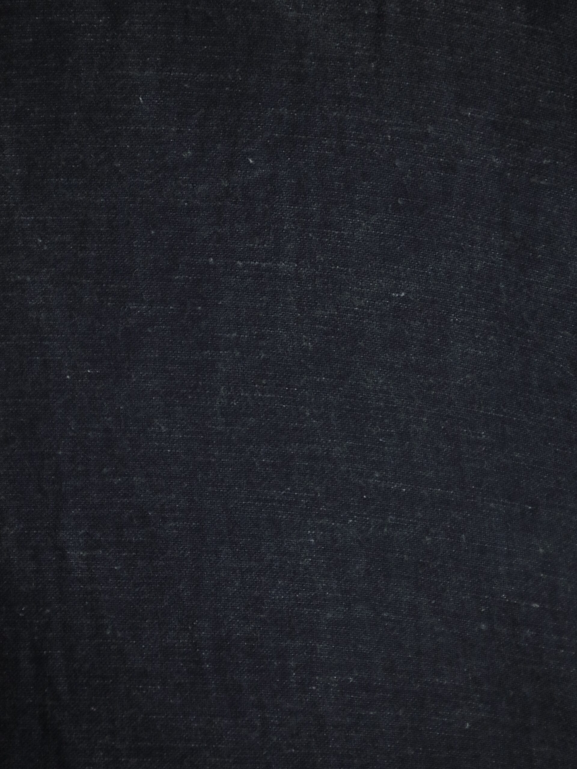 タテ糸コットン、ヨコ糸リネンのサテン生地。後染めで染められた生成りの上に濃紺の顔料を塗り、ワッシャー加工で顔料をムラが出るように落として仕上げた生地。
