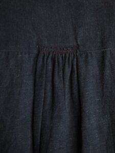 後ろ身のギャザーは8番の太い糸で寄せ、その部分が見えるように窓のようなカッティングにデザインした。
