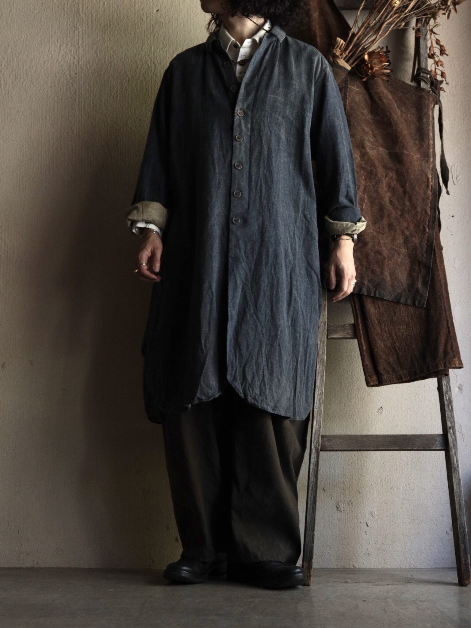 | スタイリング | 《女性①》 Shirt:YUTA MATSUOKA / New Classic Shirt (sold) Pants:YUTA MATSUOKA / Buggy Pants (sold) Shoes:EVARIST BERTRAN / EB2 Derby Shoes Necklace:YUTA MATSUOKA / Handmade Chain Necklace |