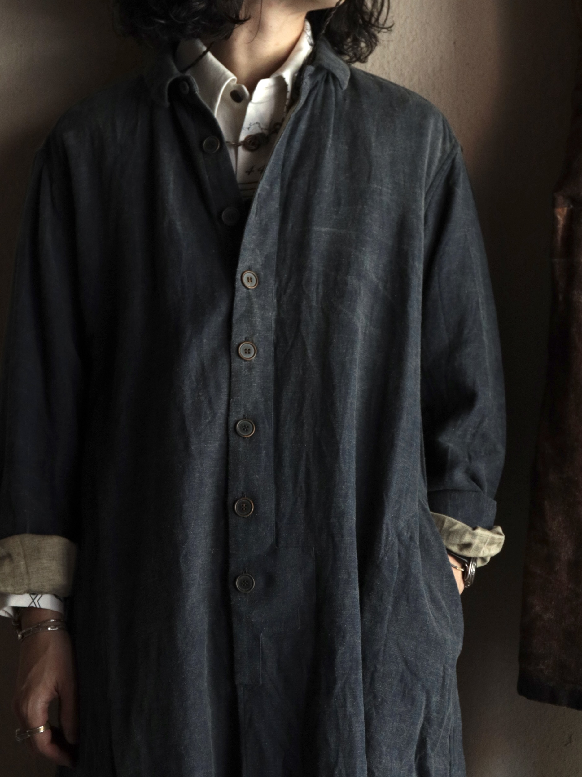 タテ糸コットン、ヨコ糸リネンのサテン生地。後染めで染められた生成りの上に濃紺の顔料を塗り、ワッシャー加工で顔料をムラが出るように落として仕上げた生地。